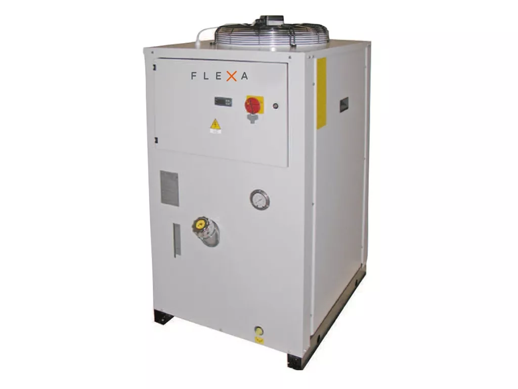 Unit chilling to cool water circulating in the surfaces of linear, single and double-side PGM, heating units, for bending of thermoplastic sheets. A closed circuit chilling unit with refrigerating compressor that can cool the water circulating in the surfaces of the linear heating units.