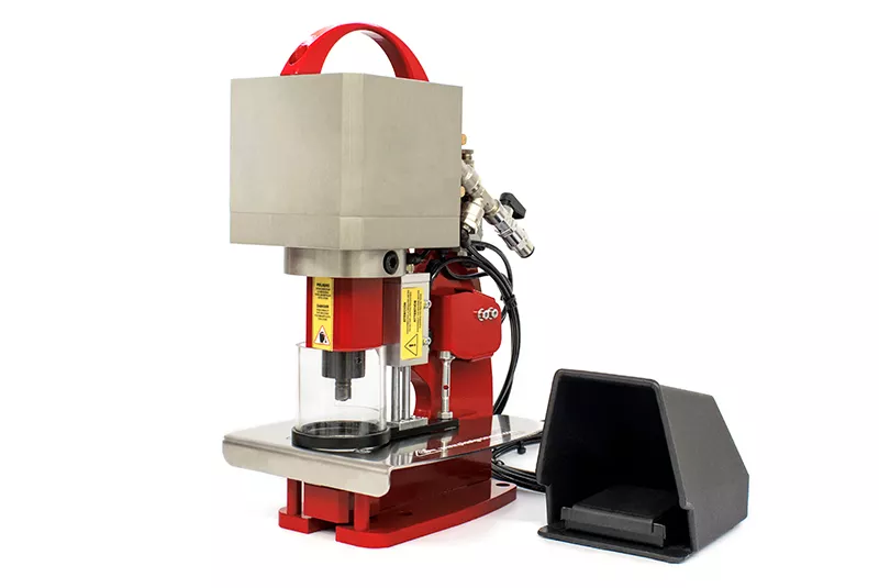 It is well-suited for small production volumes and can be used for applying both plastic eyelets or, for nickel-plated steel eyelets, a straightforward punch/matrix replacement is all that is needed.