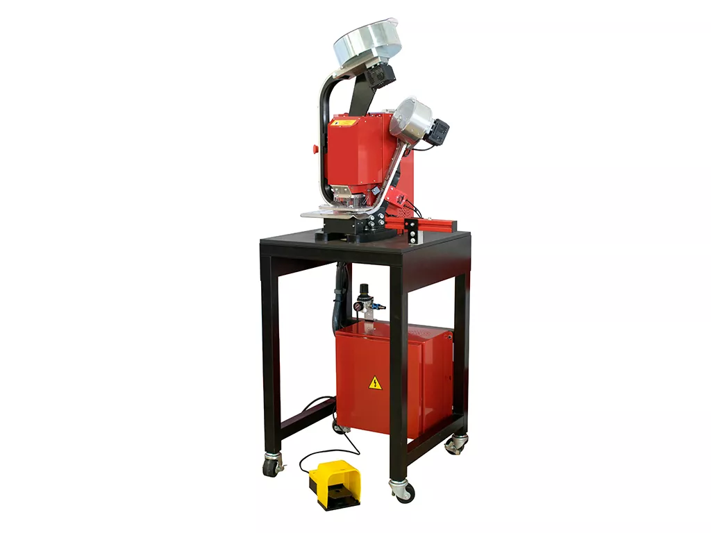 Occhiellatrice automatica autoperforante altamente performante per banner in PVC e tessuti per occhielli in plastica trasparente. Applica fino a 50 occhielli al minuto. Completa di carrello con ruote. Per volumi medio-grandi di produzione.