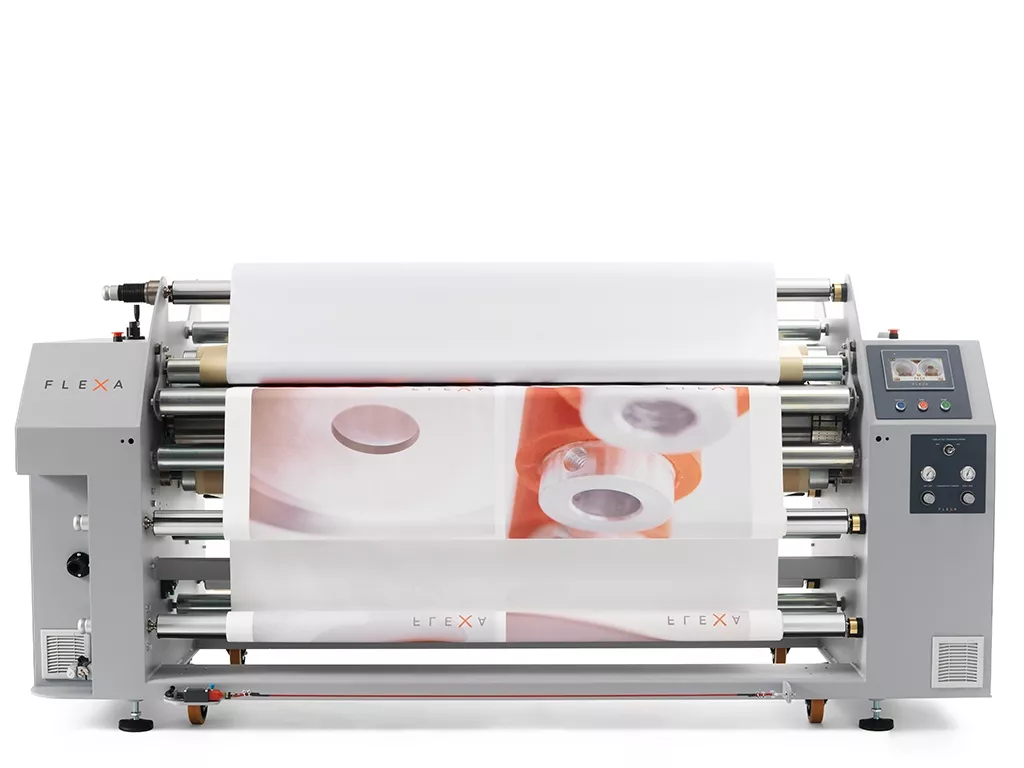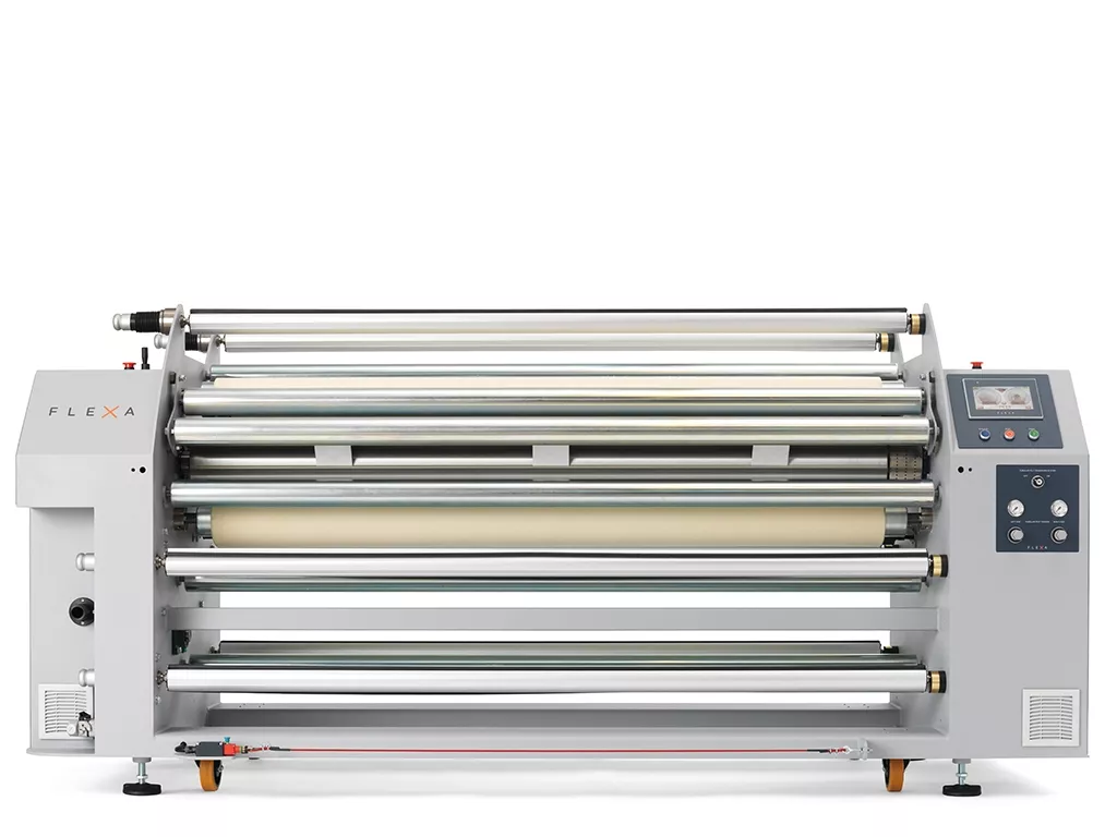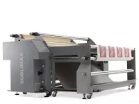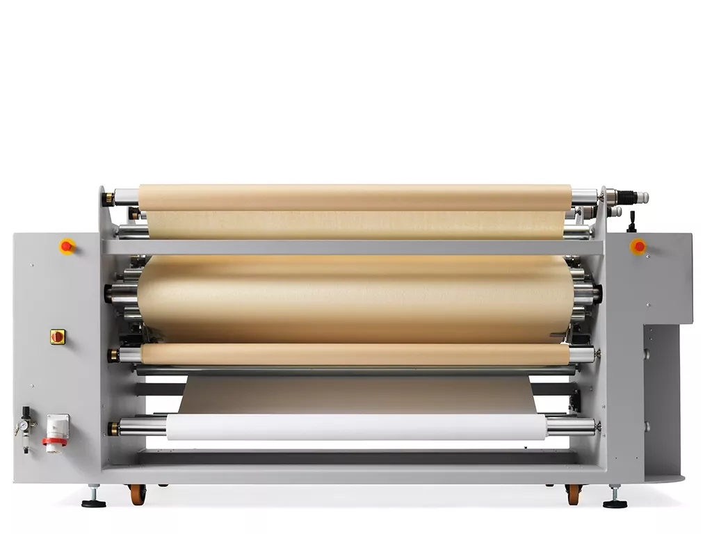 Calandra con cilindro riscaldato a olio caldo per il trasferimento termico da carta sublimatica a tessuto e fissaggio di inchiostro stampato direttamente. Macchina compatta che garantisce uniformità e stabilità di temperatura per l'intero processo lavorativo e su tutta la larghezza del cilindro.